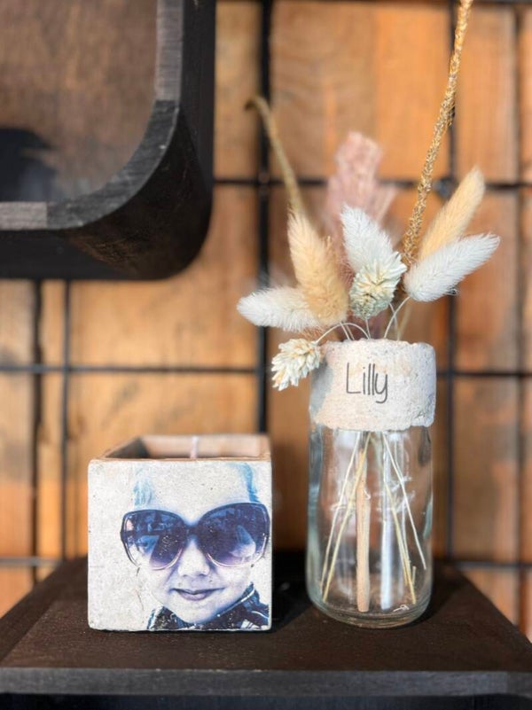 Vaasje afgewerkt met beton en naam.