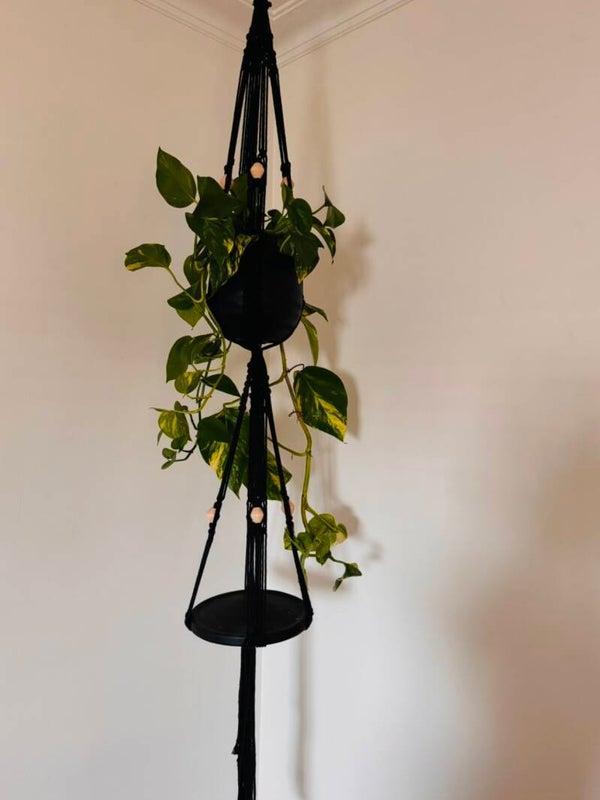 Met zwart katoendraad 5mm dikte en houten kralen maken een dubbele plantehanger. We leren de opzet maken van een plantenhanger, houten kralen inwerken en een 2e niveau bij te maken.